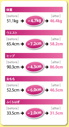 コース開始初日から、結果ははっきり表れました。「この調子なら、細い脚で彼に会える!」という実感が励みになり、家でもマッサージや半身浴をしました。本当に驚くくらい、毎日細くなっていったので、鏡を見るのが楽しくなっていきました。